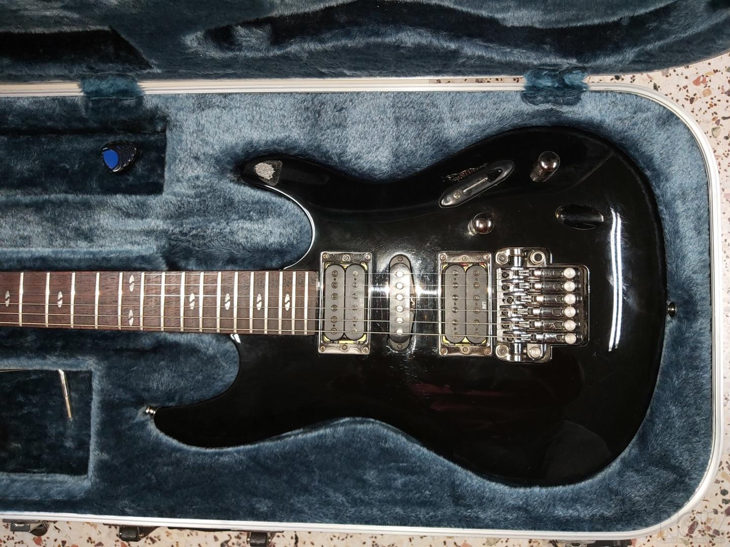 The S470 features a mahogany body bolted to a maple Wizard II neck with a 22-fret rosewood fingerboard with "S wave" position markers. Components include Ibanez pickups with a pair of humbuckers flanking a single-coil and a ZR double locking tremolo bridge which debuted in this model.