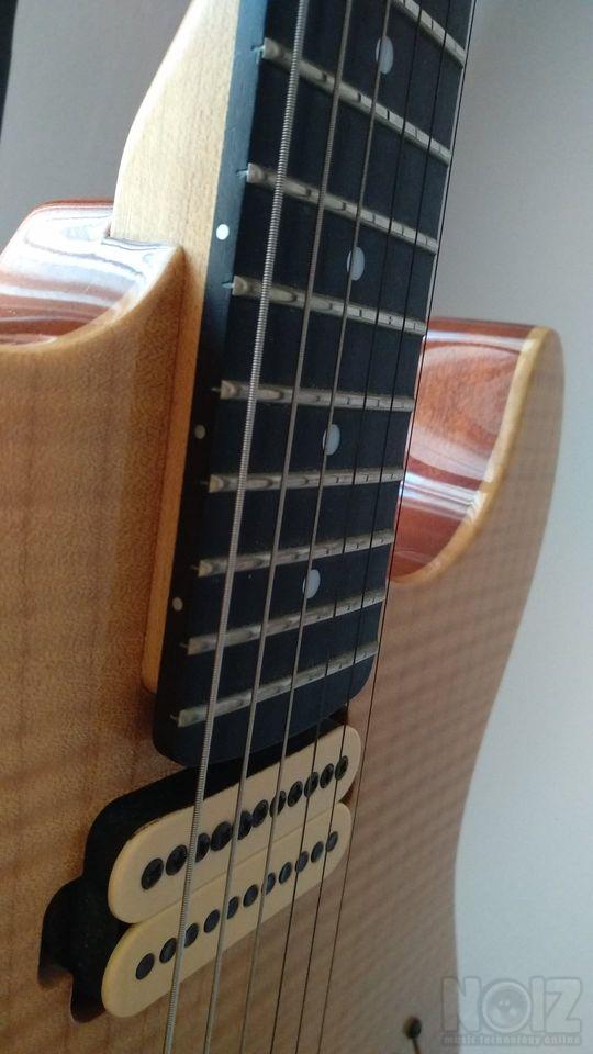 Δείχνω από κοντά την ταστιέρα. Το ξύλο από το Fretboard είναι ΟΛΟ ξύλο μέχρι έξω (τα πλαϊνά) και δεν υπάρχει πλαστικό. Δείτε και το πάχος του fretboard!!! Στις περισσότερες κιθάρες στο fretboard δεν είναι το ξύλο μέχρι έξω, και έχει γύρω-γύρω πλαστικό μέρος. Επίσης, ο έβενος της ταστιέρας στην Carvin είναι ΚΑΤΑΜΑΥΡΟΣ!