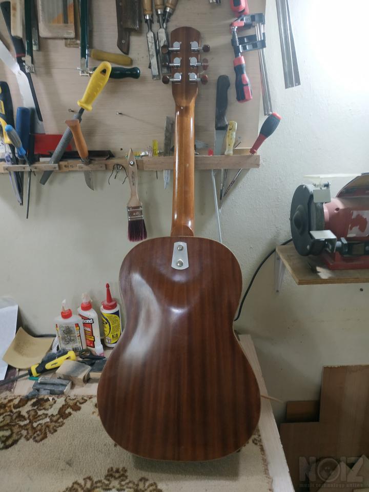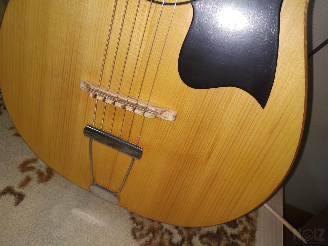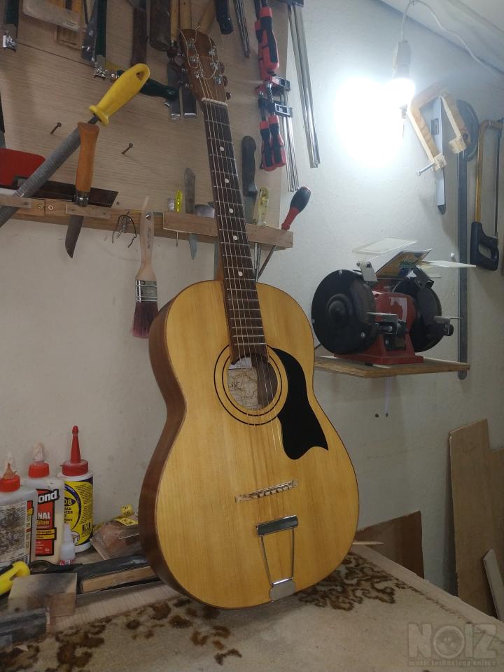 Παλιά κιθάρα ΕΚΟ με νέο καπάκι από παλιό έλατο, καινούργια κλειδιά και χορδές, νέα γέφυρα, νέα λούστρα (γομαλάκα), κλίμακα 60, ήχος blues και ρεμπέτικος. Ανακατασκευασμένο από οργανοποιό.