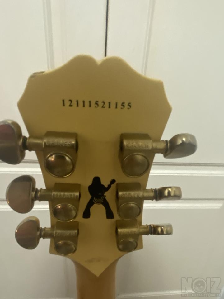 Πωλείται η κιθάρα του τίτλου σε κατάσταση άριστα λειτουργικά και πολύ καλή αισθητικά. Έχει ένα χτύπημα στο φινίρισμα στο headstock, χωρίς να έχει κινδυνεύσει από σπάσιμο ή βλάβη. Διασώθηκε εκ μέρους μου από τον προηγούμενο ιδιωκτήτη που την είχε παραμελήσει. Έχω κάνει αρκετή δουλειά για να επαναφερθεί σε άρτια κατάσταση (δουλειά στα τάστα από εμένα, πολλαπλοί καθαρισμοί, σέρβις στα ηλεκτρονικά από τεχνικό). Έχουν αντικατασταθεί κάποια από τα πλαστικά μέρη με καινούργια (neck pickup ring, knobs) λόγω του ότι είχαν ραγίσει.