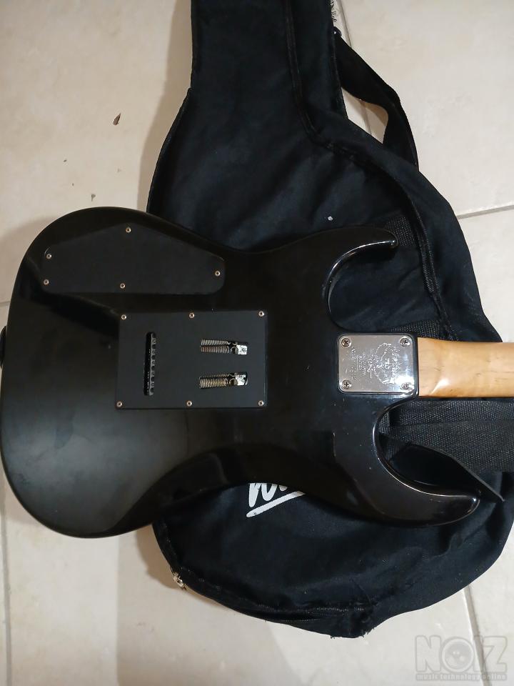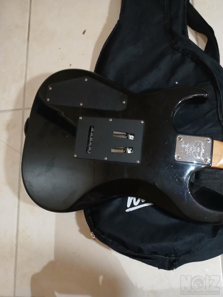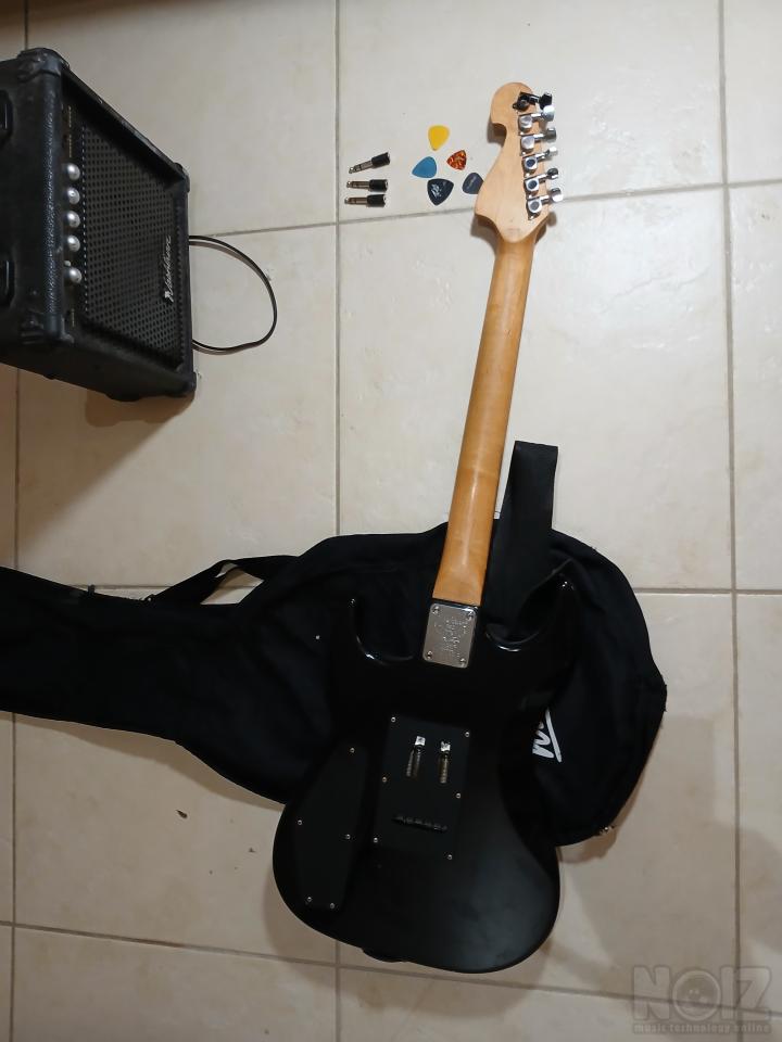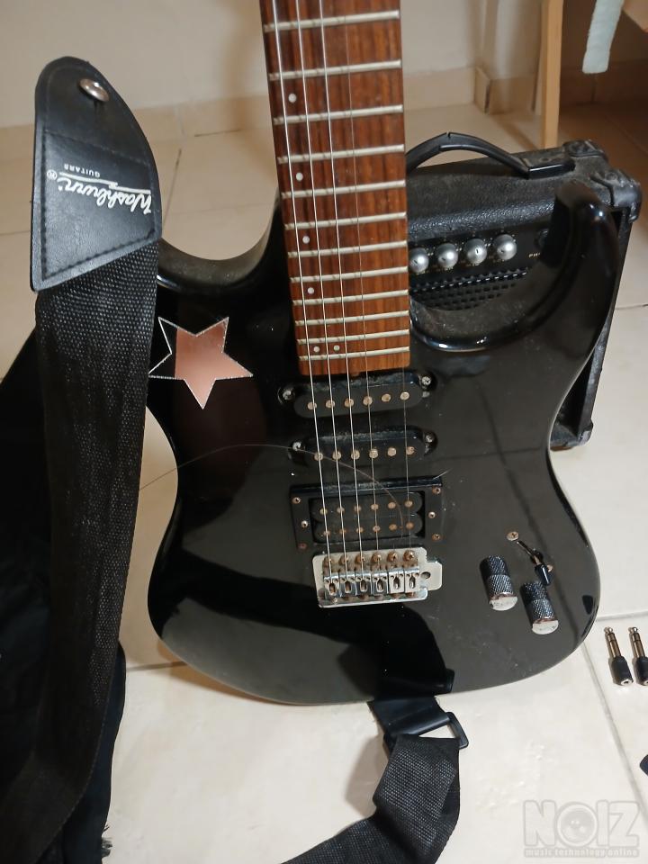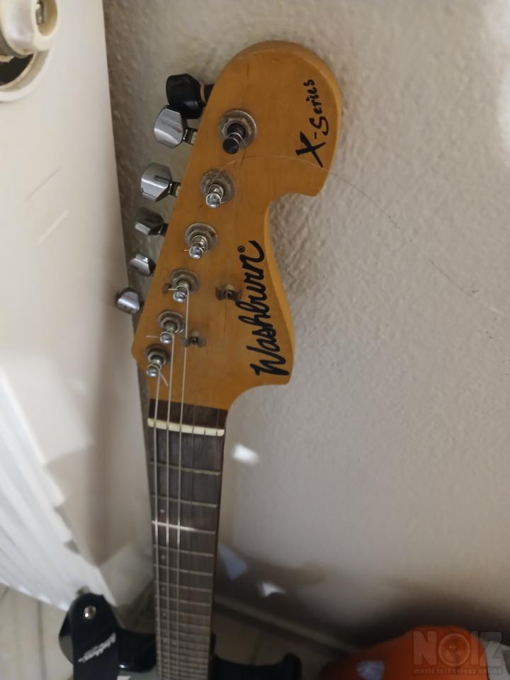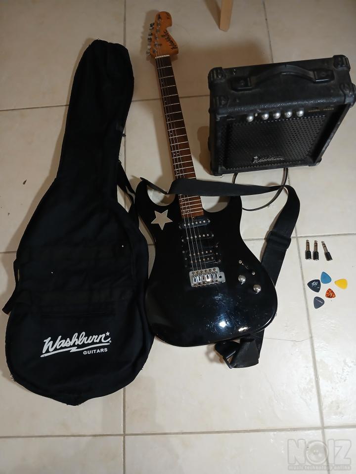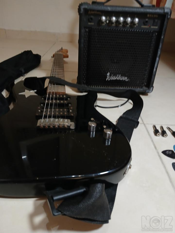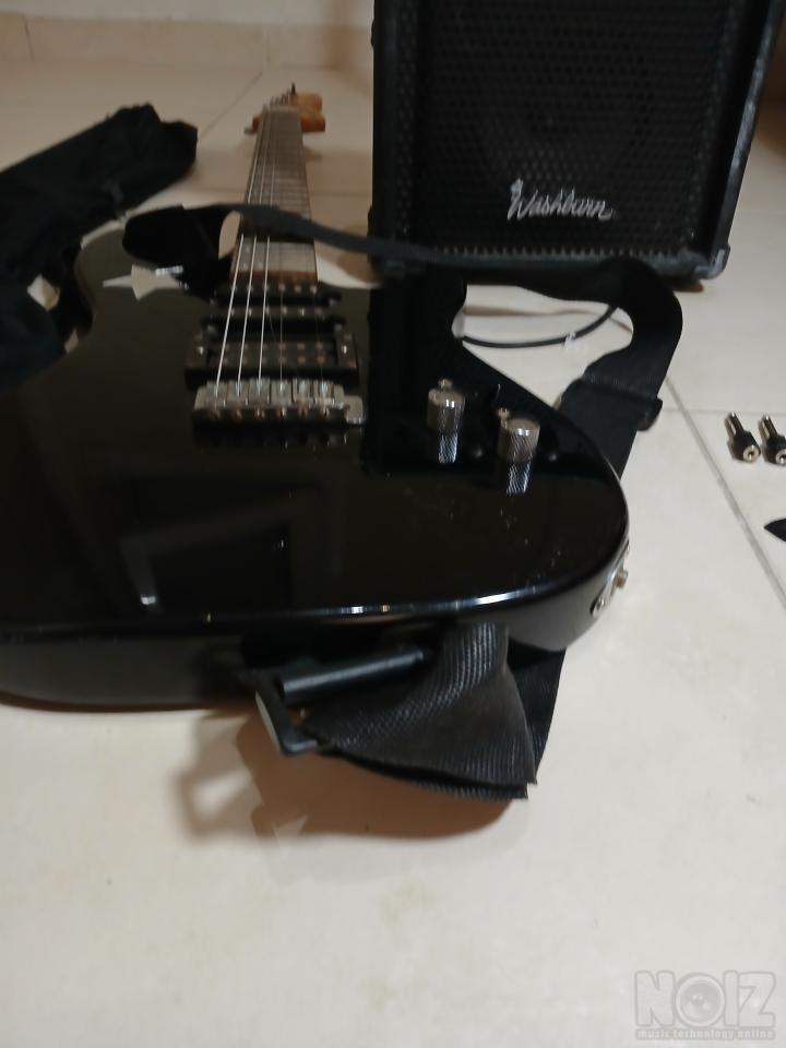 Ηλεκτρική κιθάρα Washburn Pro X-SERIES 2010 κατασκευής με γυαλιστερό φινίρισμα μαύρο, εξαιρετικό ήχο 6 χορδών από τις οποίες οι δύο θέλουν αλλαγή..Στην πίσω πλευρά της κιθάρας αναγράφεται ο σειριακός αριθμός και επιφέρει σφραγίδα Washburn pro hand crafted since 1876..Μαζί με την κιθάρα θα δοθεί και ο ενισχυτής με 5 πένες