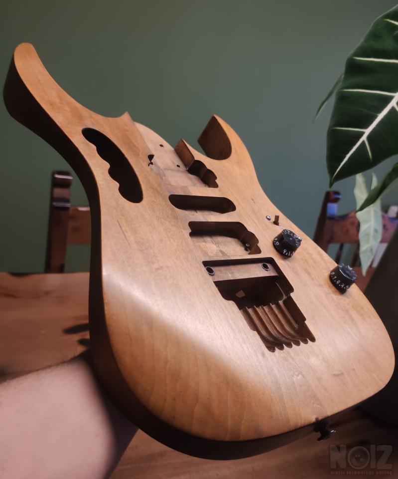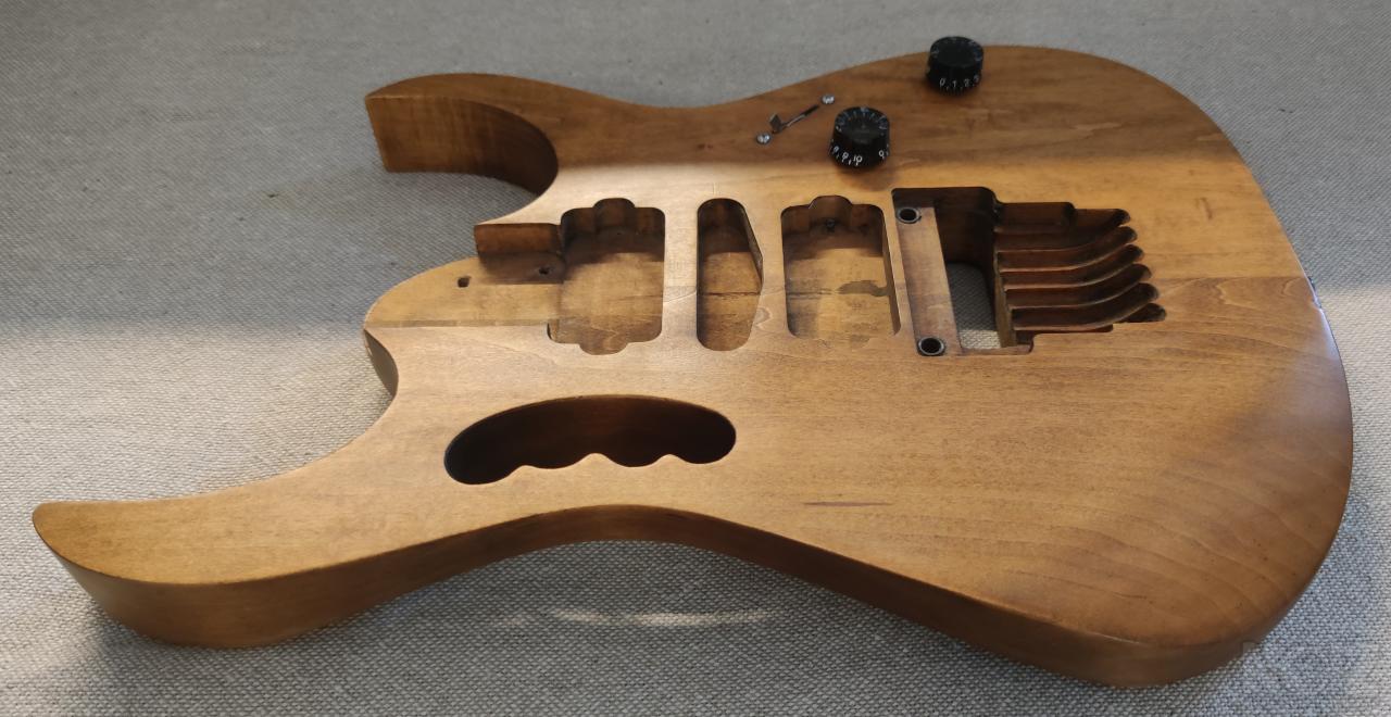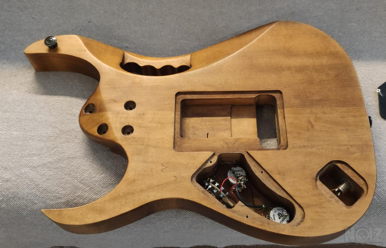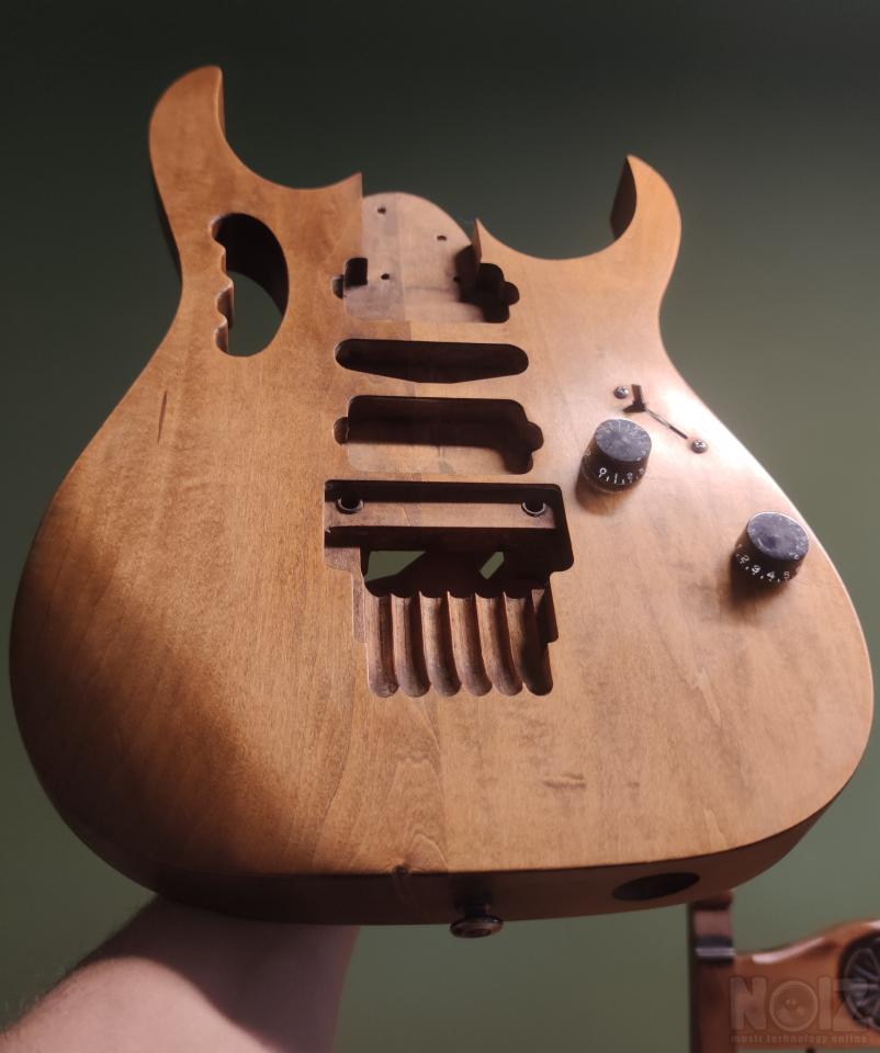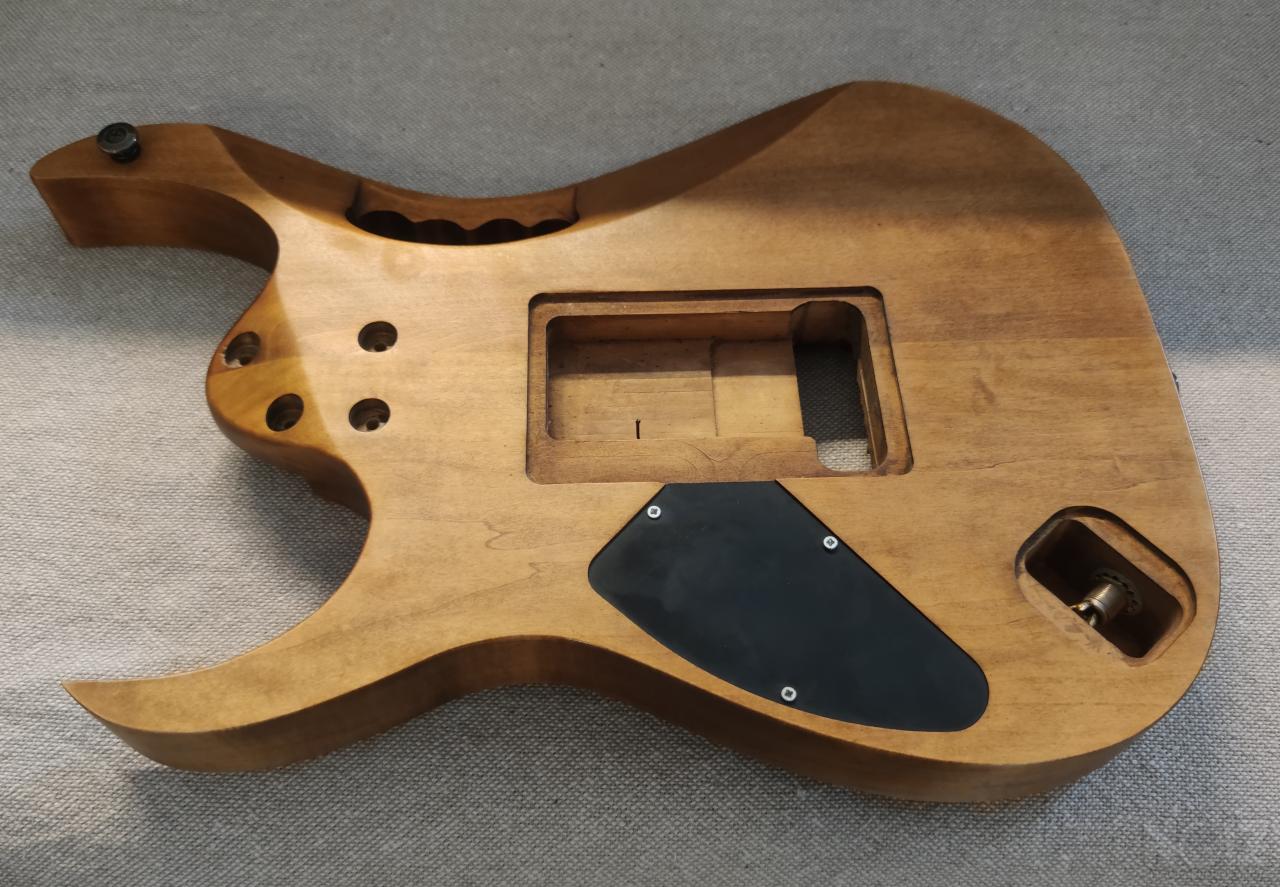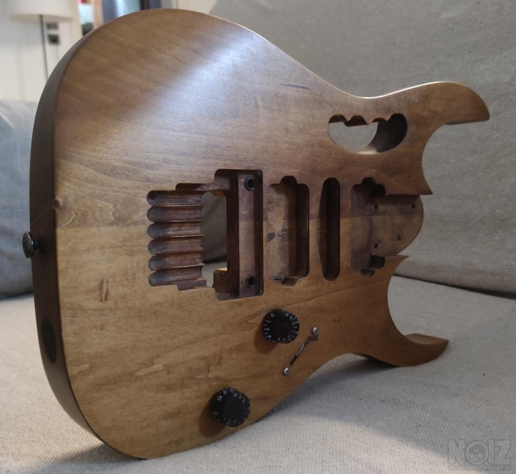 Το σώμα είχε αγοραστεί κάπου το 2008 από ebay Αμερική για ένα project το οποίο ολοκληρώθηκε όμως εγινε παλι κομμάτια. Είναι φυλαγμένο περίπου από το 2012. Είχε αγοραστεί άβαφο και εχει γίνει επεξεργασία με ειδικά βερνίκια σε φινίρισμα ματ/ξύλο από ειδικο.To ξύλο του σώματος είναι basswood.Επίσης είναι τοποθετημένα όλα τα ηλεκτρικά με 5θεσιο επιλογέα /jack input καθώς και 500ρια ποτενσιόμετρα japan.Το Neck pocket είναι συμβατο για AANJ necks της ibanez.
