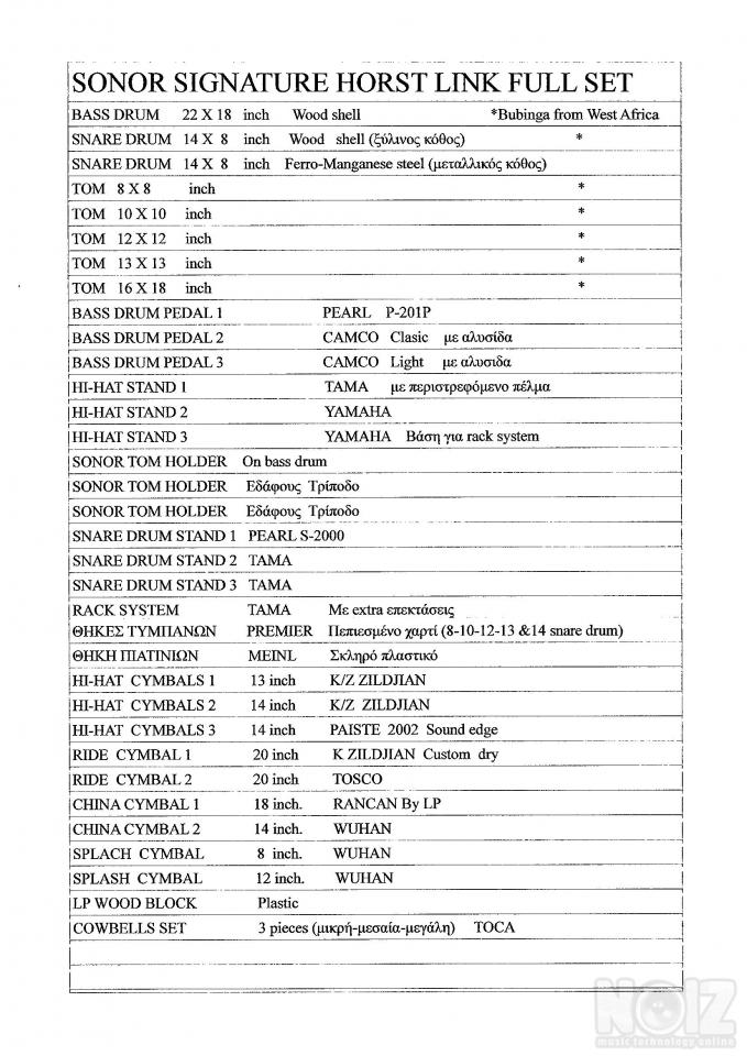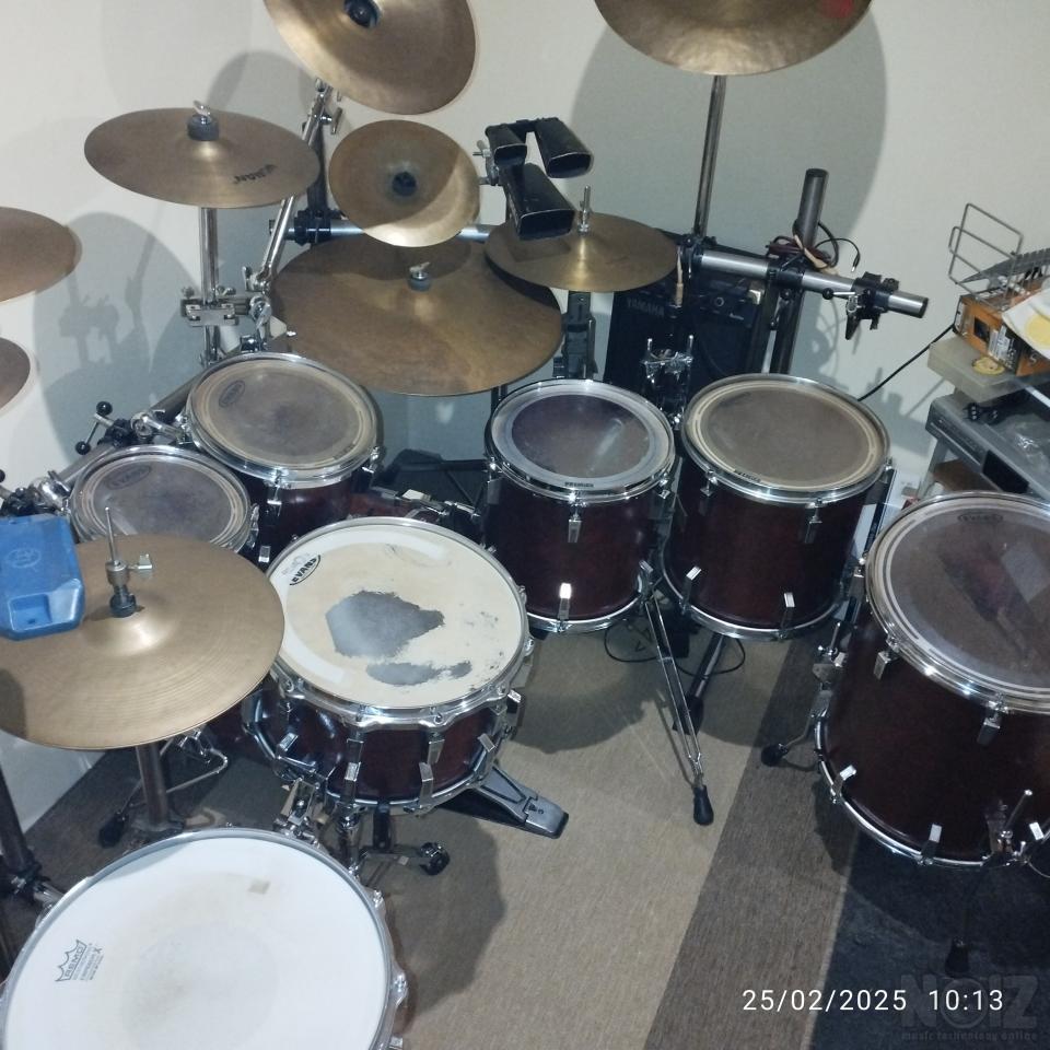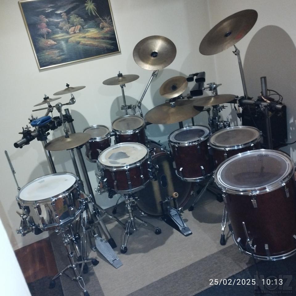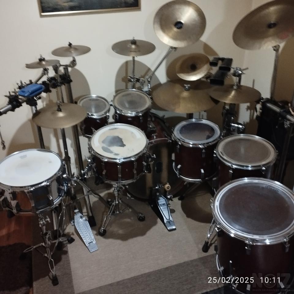 Κάσα 22χ18 - Δύο ταμπούρα (14χ8 ξύλινος κόθος και 14χ8 μεταλλικός κόθος).8χ8-10χ10-12χ12-13χ13 & 16χ18 βαθύ.3 ζευγάρια χαϊ-χατ(13-14-14).Ρακιέρα πλήρης, όλες οι βάσεις, πετάλια για κάσα και βάσεις χαϊ-χατ(2 εδάφους και μία για ρακιέρα). Πιατίνια και πολλά άλλα έξτρα.