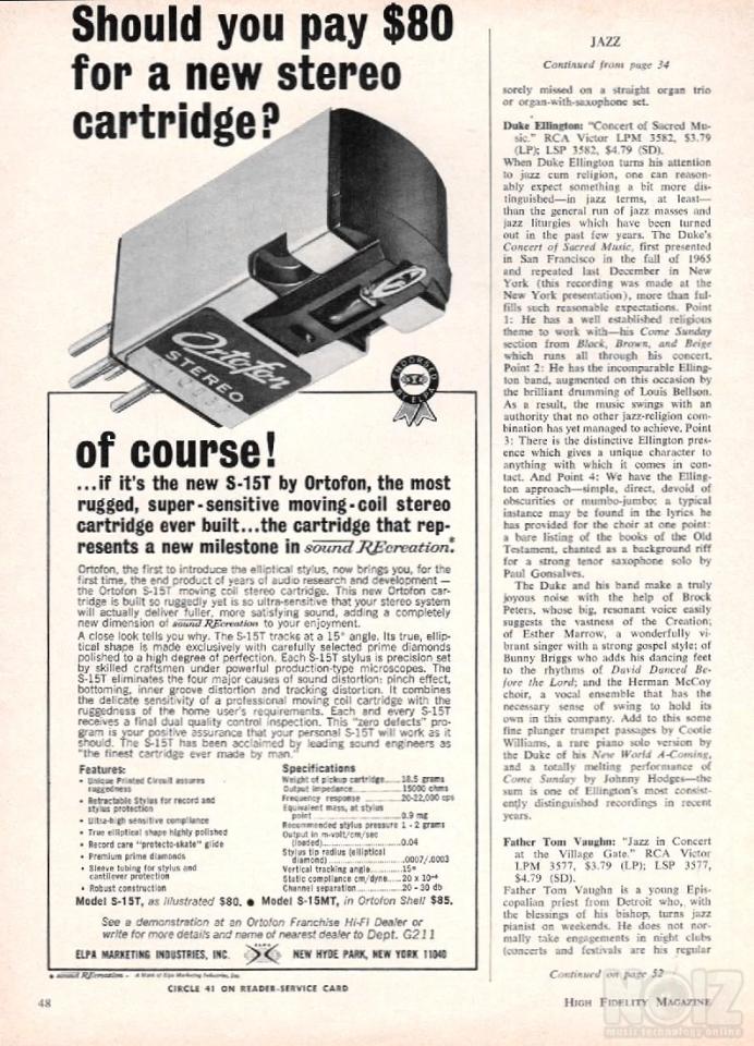 Μοναδική High End στερεοφωνική κεφαλή κινητού πηνίου Ortofon S-15 M/T από τη δεκαετία του 60. Κυκλοφόρησε το 1967 και θεωρείται μέχρι σήμερα μια από τις καλύτερες κεφαλές κινητού πηνίου με τεχνικά χαρακτηριστικά που ήταν πολύ μπροστά για την εποχή τους.