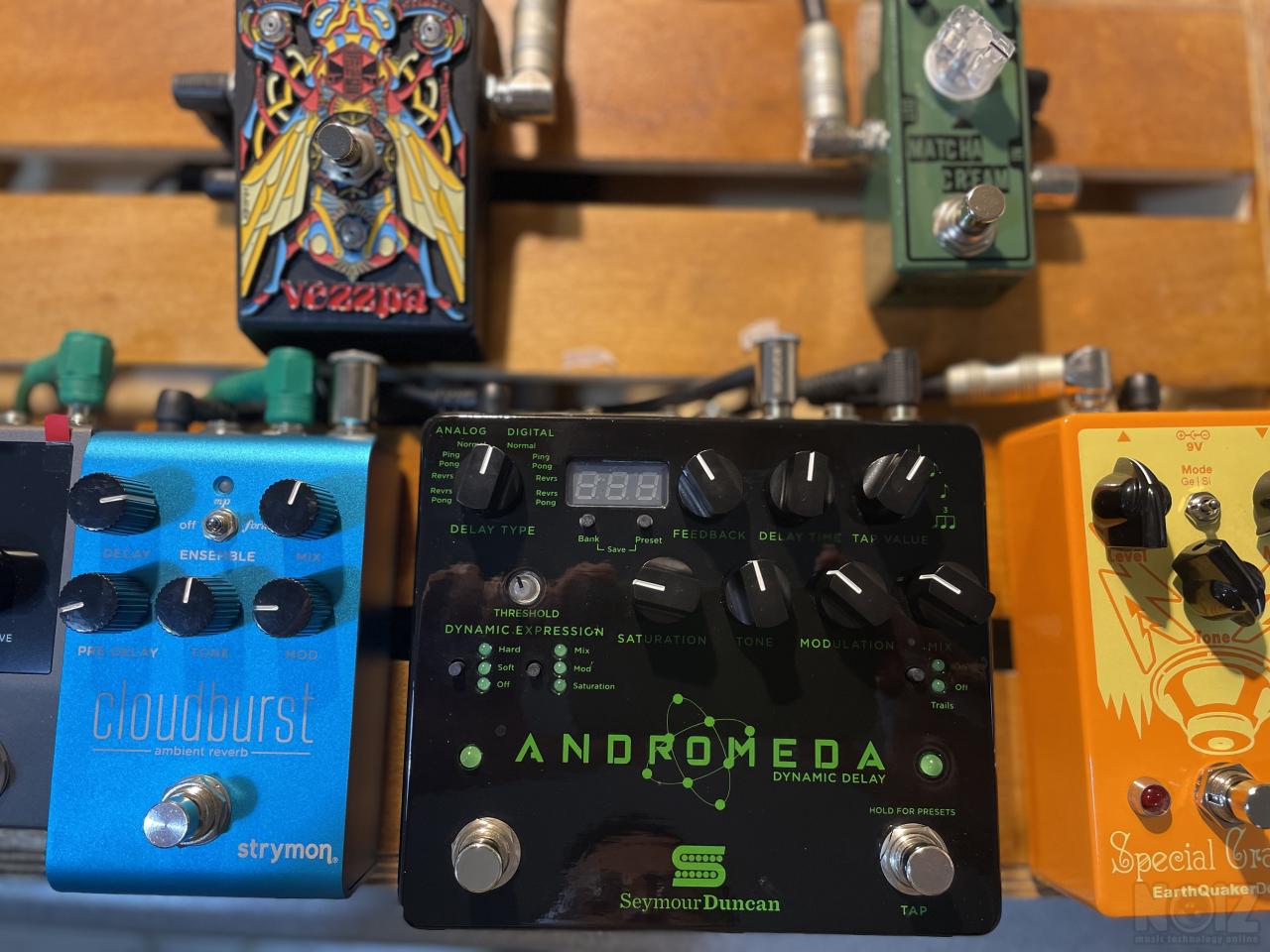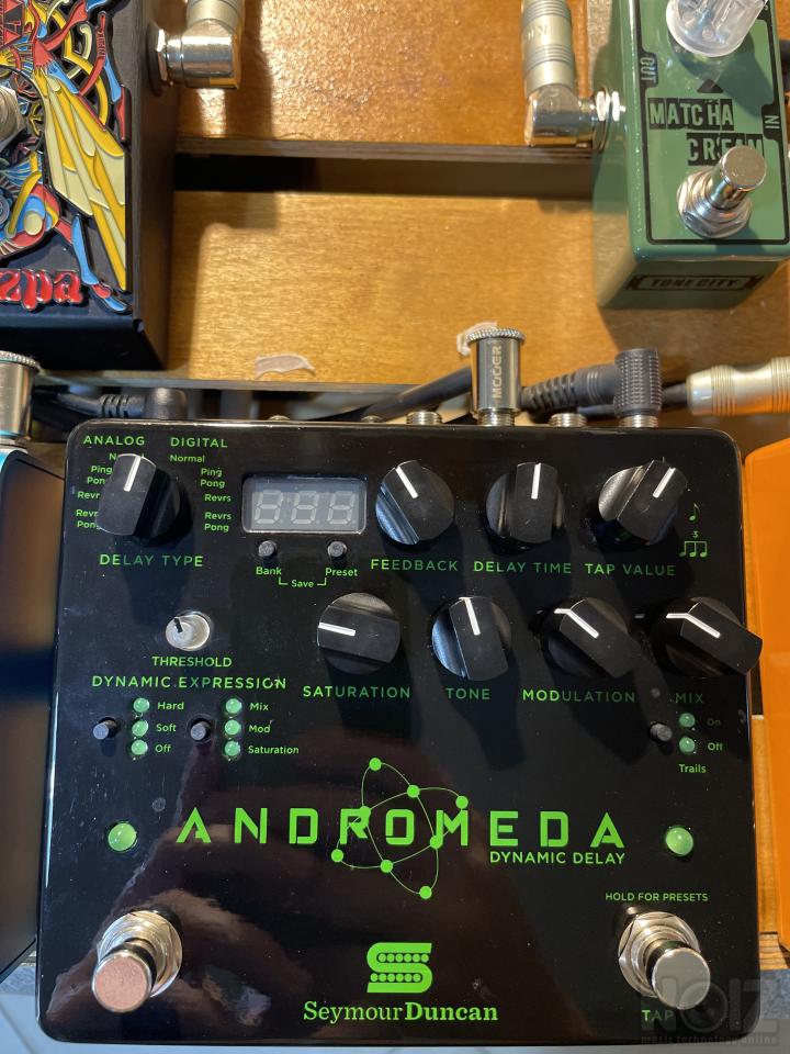 The Andromeda is a fully-furnished dynamic delay pedal with plenty of options for the discerning time traveler. The Andromeda is as much a performance tool as it is a delay machine, with plenty of options available for expressive players that demand more from their effects. With eight delay modes divided into analog and digital, the Andromeda covers the bases of delay while introducing some inventive new modes such as Reverse Ping Pong. Featuring a full payload of parameters including highly-customizable controls such as Saturation and Tone, the Andromeda offers full control over standard delay functions, then adds tap tempo with a handful of tap subdivisions, selectable trails, 128 presets, true stereo ins and outs, as well as full MIDI integration with In and Thru jacks. What sets the Andromeda apart from the rest of the delays in its class is its Dynamic Expression section. The lower left section of the Andromeda's control panel gives you a switching matrix where you can select which parameters you'd like to control using your picking strength. You can set how just how much the picking strength manipulates the controls, and you can set the threshold of control using the illuminated knob. You can control Mix, Modulation or Saturation dynamically, giving you a pick-controlled expression pedal that is capable of pushing your tone to the outer limits. And just like all Seymour Duncan pedals, the Andromeda Dynamic Delay is designed in California and then made right here in the USA.