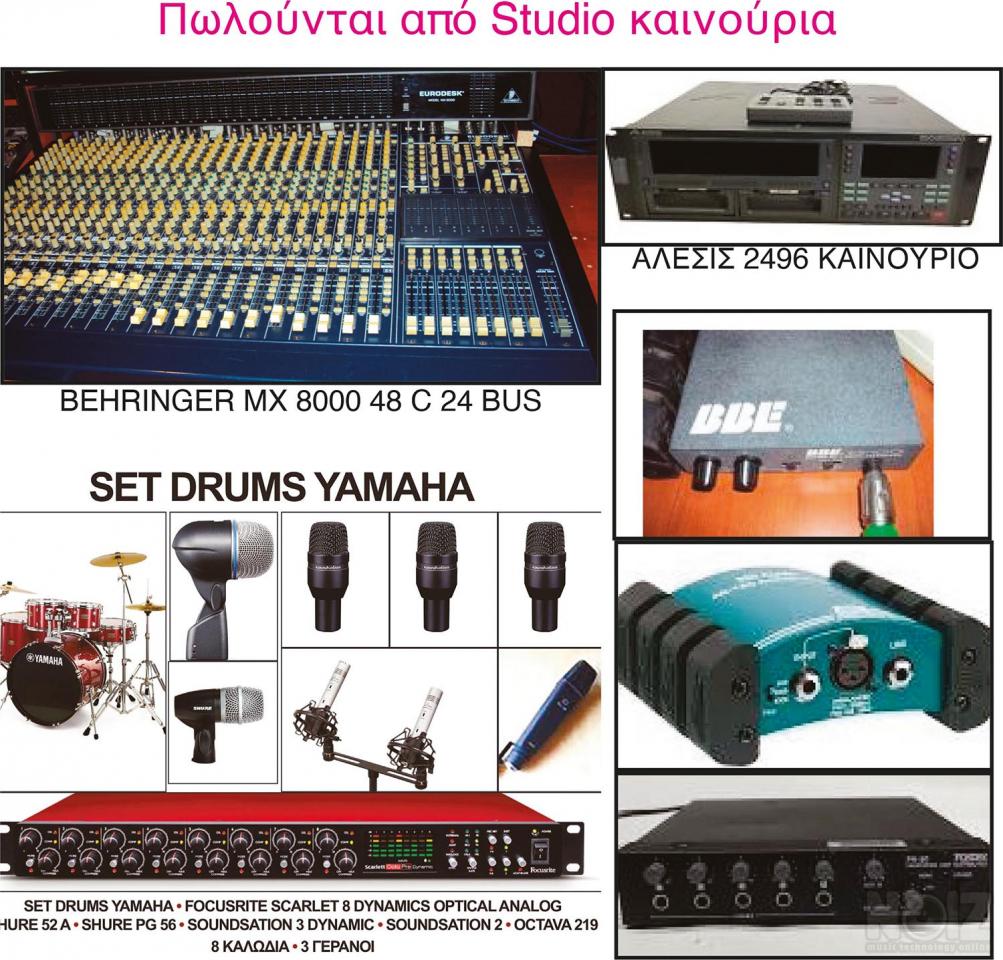 Πωλούνται από στούντιο στην Αθήνα, Κονσόλα ΒΕΗRINGER ΜΧ 8000, μαγνητόφωνο ΑLESIS 24/96 (καινούριο) προενίσχυση SCARLET FOCUSRITE 8 καναλιών με κομπρέσσορα και στα 8 με εξόδους ANALOG KAI OPTICAL ντραμς YAMAHA (καινούρια) σετ μικροφώνων ντράμς SHURE (καινούρια όλα) καλώδια γερανοί, DI (BEE BSS) Προενισχυτής ακουστικών FOSTEX (καινούριο)
