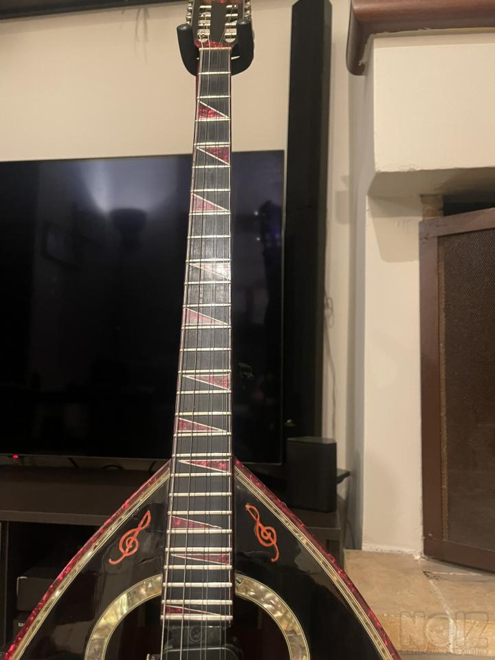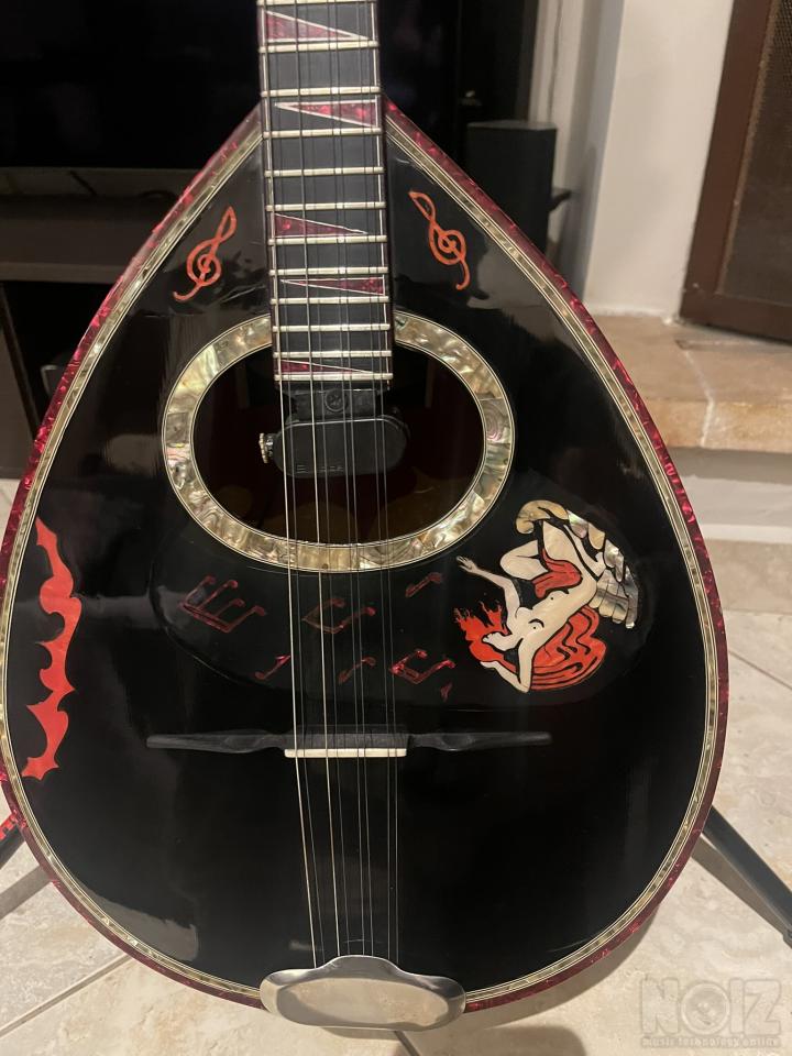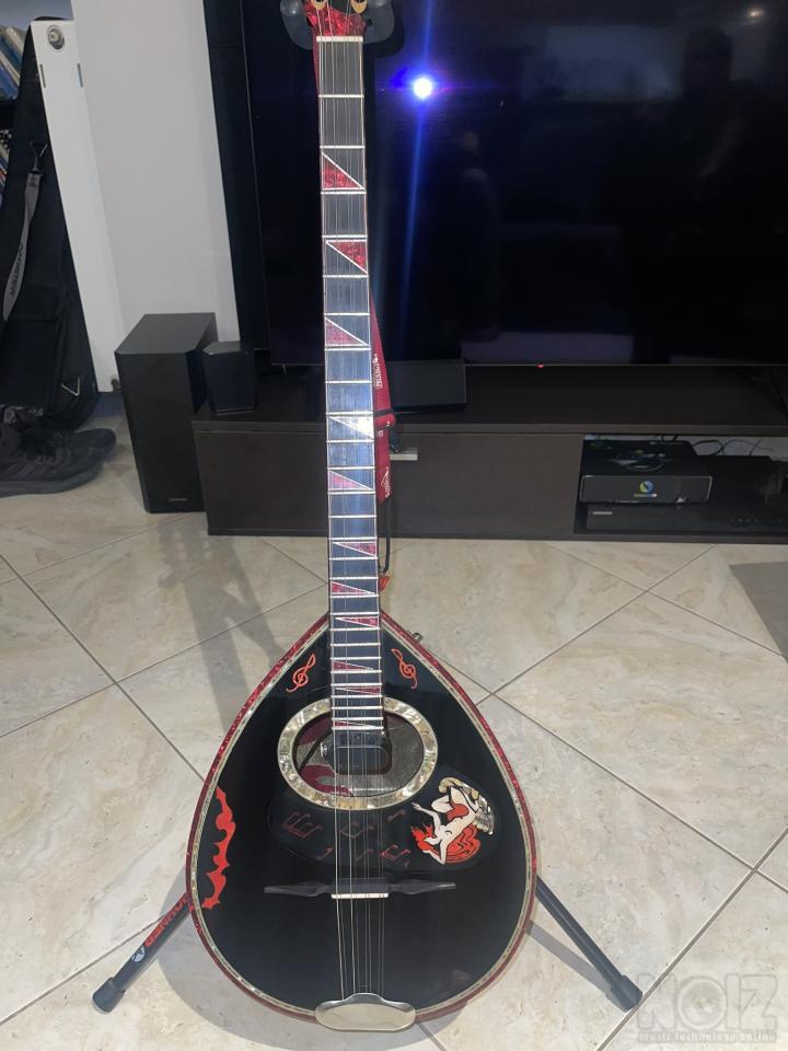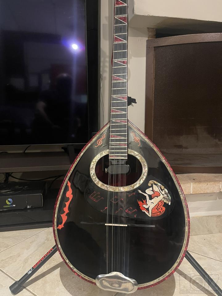Μπουζούκι οκτάχορδο 60 ντουγιες κελεμπεκι, κεντημένο μαύρο καπάκι βαμμένο ανελινη μαυρη έλατο Άλπεων ταστιερα έβενος με ασετονοπαστα κόκκινη τρύπα όστρακο.