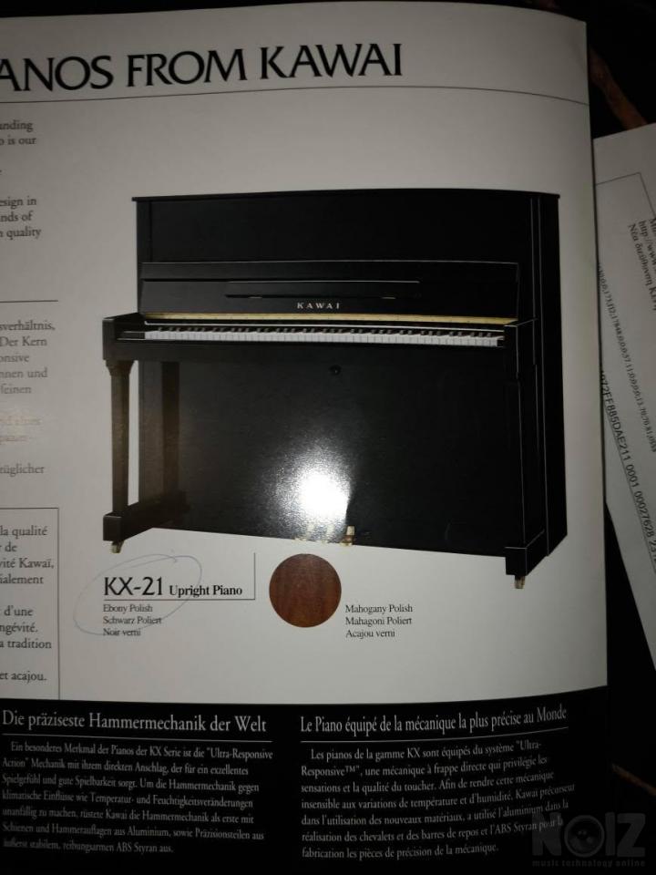Το Kawai KX21 είναι ένα ακουστικό όρθιο πιάνο που σχεδιάστηκε για να προσφέρει πλούσιο και βαθύ τόνο χάρη στο αυξημένο ύψος του και τη μεγάλη του επιφάνεια αντήχησης, με «επαγγελματική» δράση για πιο γρήγορη επανάληψη πλήκτρων και σταθμισμένα πλήκτρα για ομοιόμορφη αίσθηση. Το έτος κατασκευής του δεν καθορίζεται από ένα συγκεκριμένο μοντέλο, αλλά αναφέρεται σε παραδείγματα του 2008 και μετά, καθώς πρόκειται για μεταχειρισμένα μοντέλα.