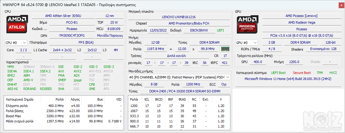 12 GB DDR4 (max), 240 GB nvme m2. Η μπαταρία με νορμάλ χρήση κρατάει από 1,5 έως 2 ώρες.