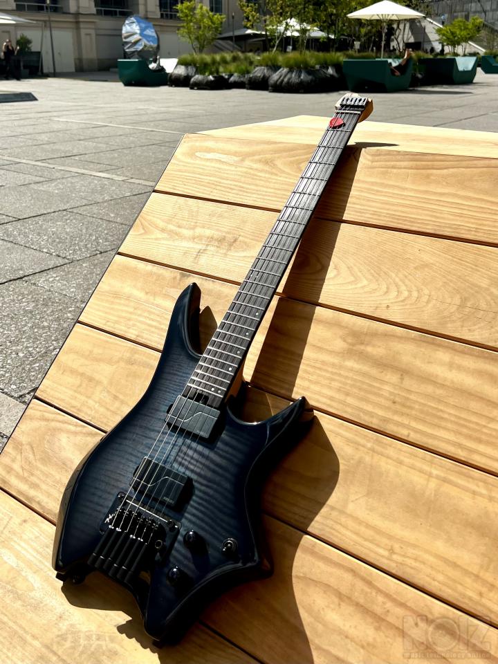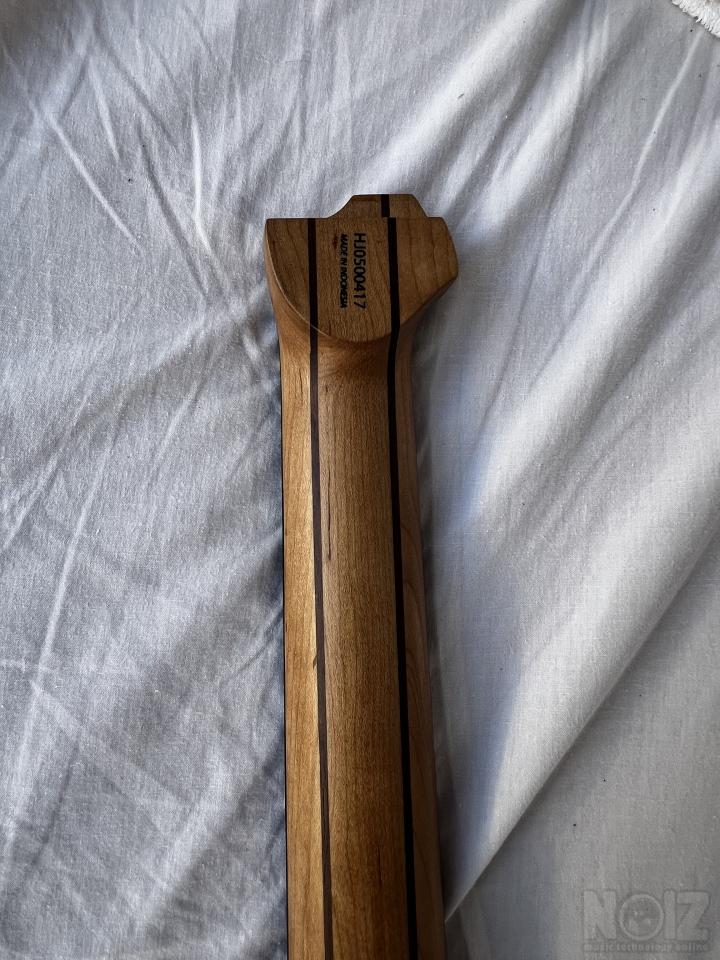 Very lightweight, around 2,5 kg. Roasted maple neck, stainless steel frets. The neck has a pleasant satin feel.