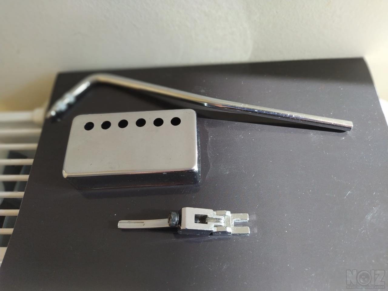 Ένα κάλυμμα διπλού μαγνήτη χρωμίου, ένα βαγονακι χρωμίου για γέφυρα floyd rose tremolo και ένας λεβιές χωνευτος για ibanez floyd rose tremolo.
