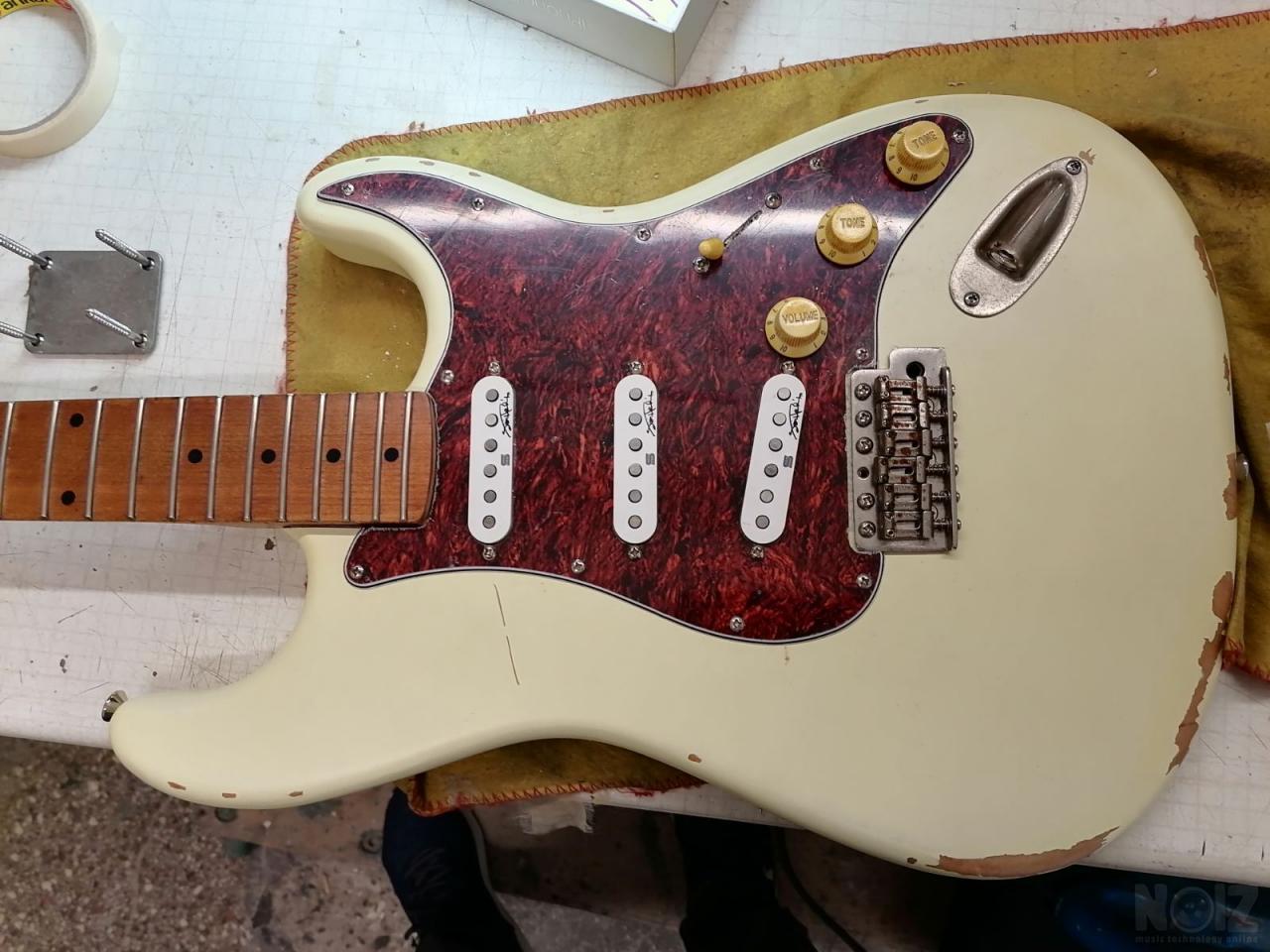 Like Jimi’s music, the Jimi Hendrix Signature Strat pickups have their roots in the traditional but with an eye on the future. Each pickup is custom wound for a richer, melodic tone. The bridge model has an aggressive attack that cuts through while staying true to Jimi’s iconic lead tone. The neck/middle pickup sounds thick and full and is great for chord work, bluesy melodies, double-stops and Jimi’s signature hybrid chord/melody style. And in the in-between positions there’s plenty of that classic Strat ‘quack.’ When it comes to specs., Seymour is meticulous about vintage correctness, and the original Strat set that he wound for Jimi in 1968 did not have an RWRP middle pickup. Therefore, just like the originals, the middle pickup of these accurate recreations is also not RWRP.